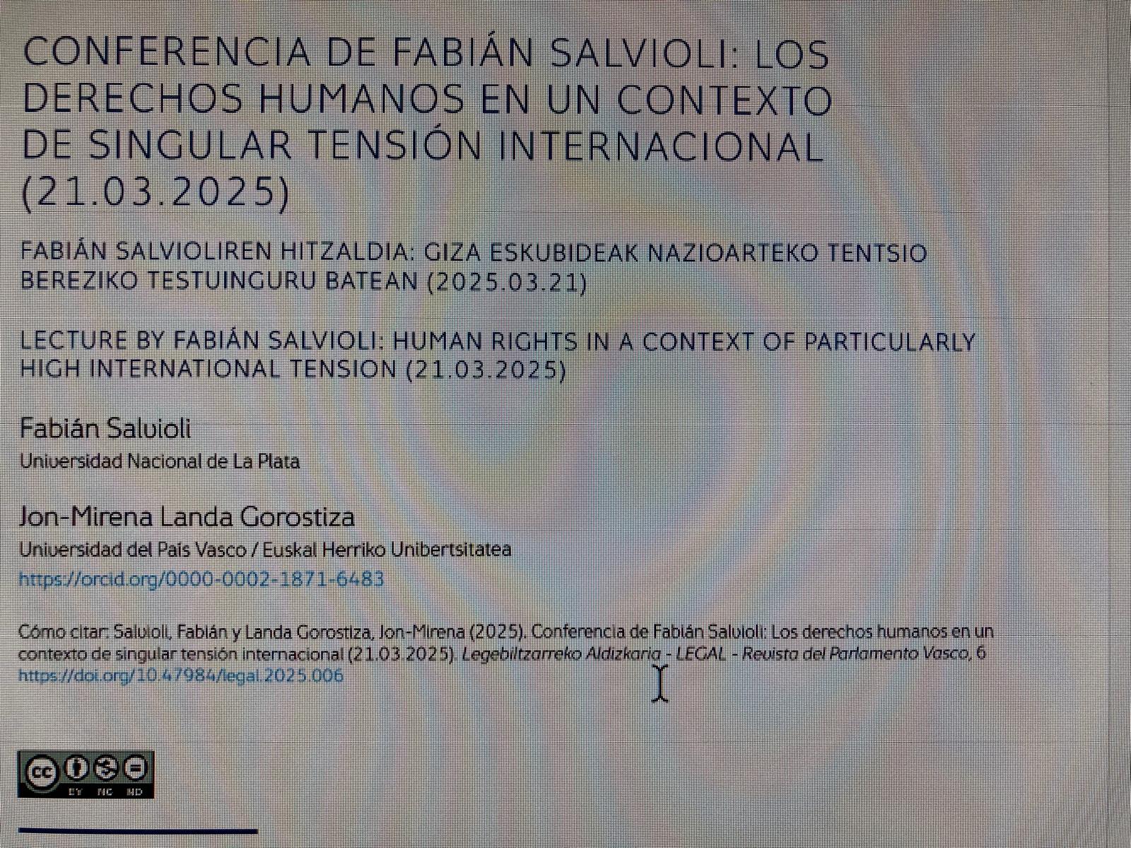 Fabián Salvioli y Jon-Mirena Landa. Conferencia de F. Salvioli: Los derechos humanos en un contexto de singular tensión internacional